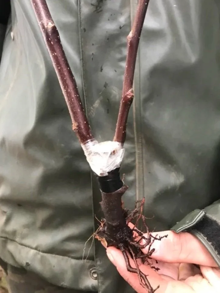 The rootstock is selected for its traits specific to growth habit, disease resistance and root vigor. For small gardens, a dwarfing rootstock like M9 is ideal, as it produces a compact tree up to 10ft tall. The scion wood provides the fruit, and is typically collected from healthy, one-year-old shoots when trees are dormant. Timing is key! We have had most success with grafting freshly cut wood in late winter or early spring, just as the buds begin to swell.