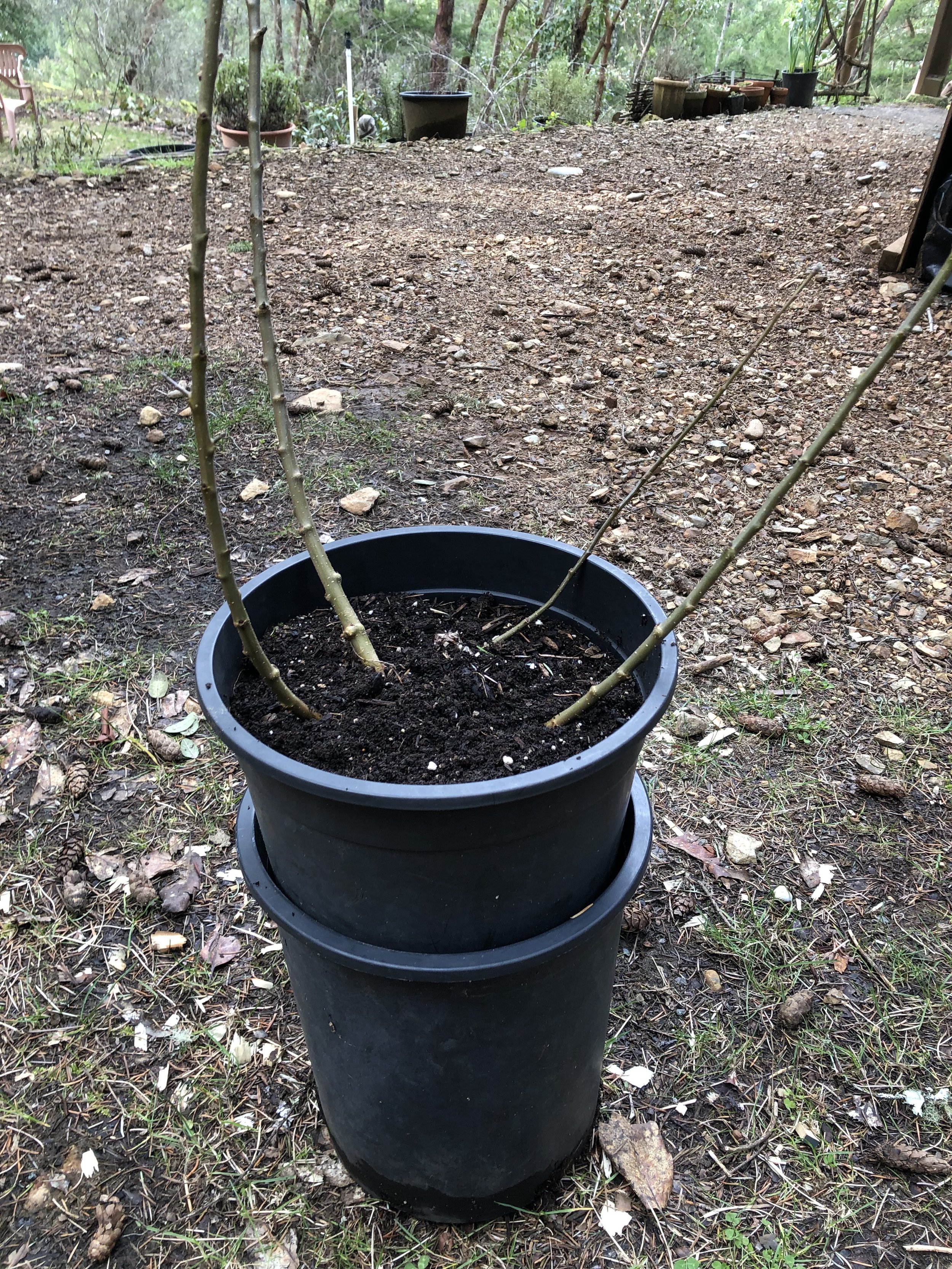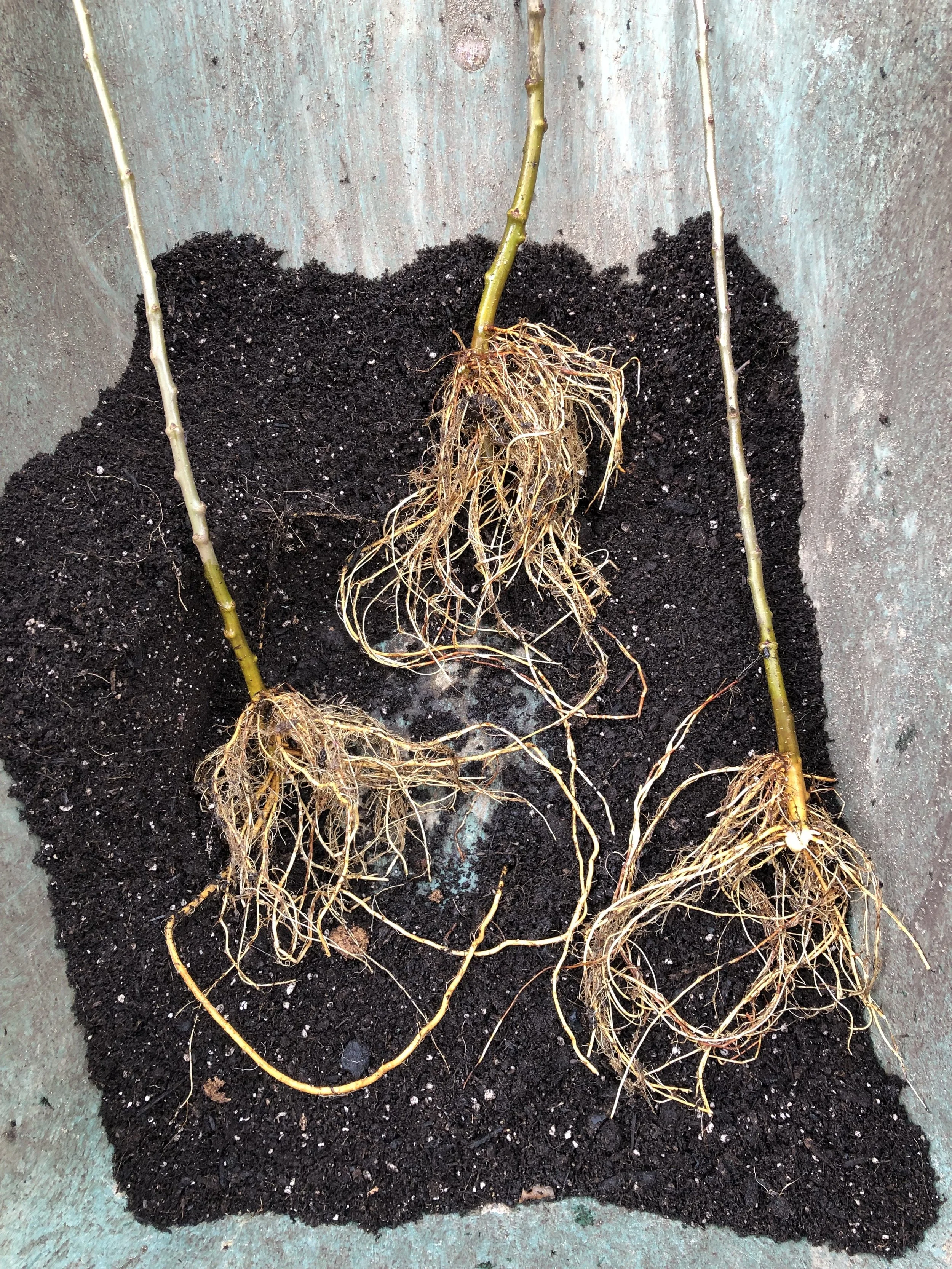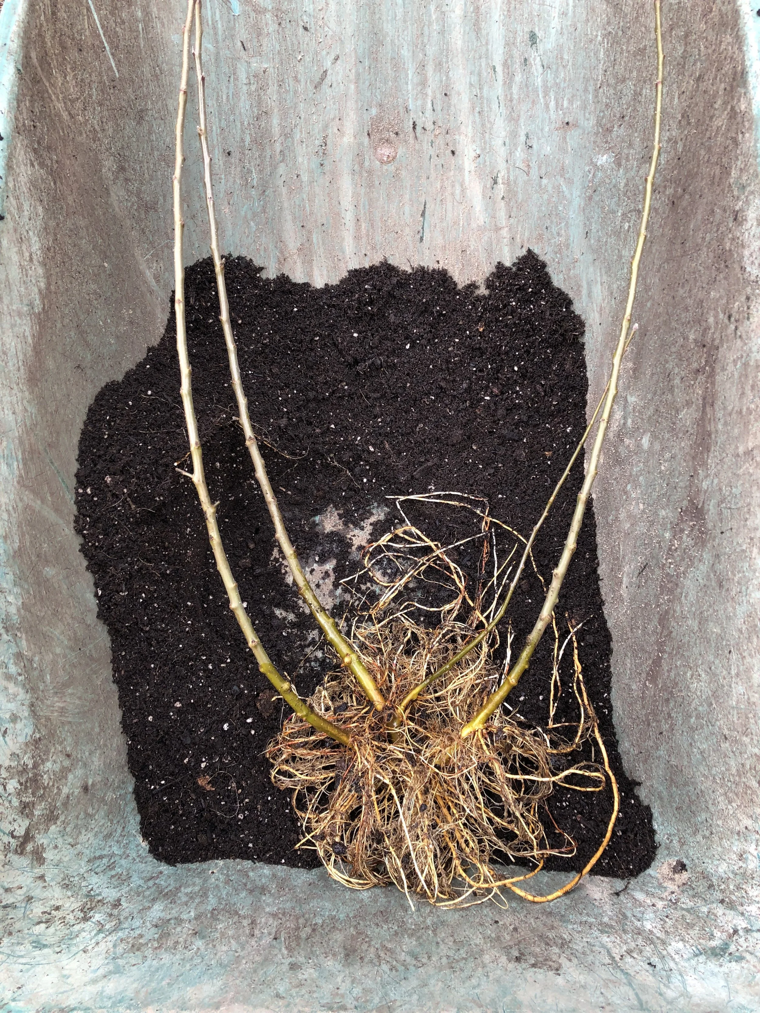 By late winter, we removed the upper pot and gently worked away the soil to reveal that several of the shoots had developed their own roots. I was able to separate four well-rooted shoots from the original plant—effectively turning one rootstock into four in a single year.