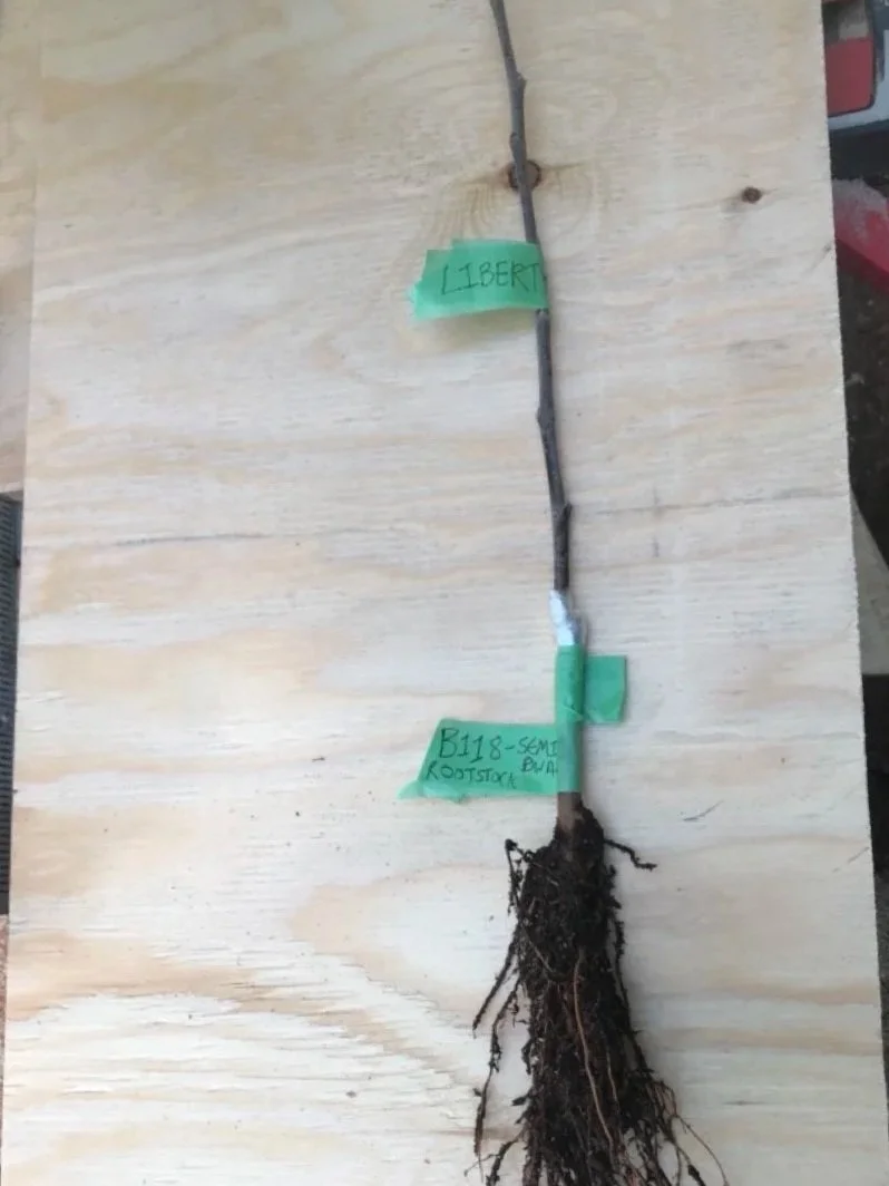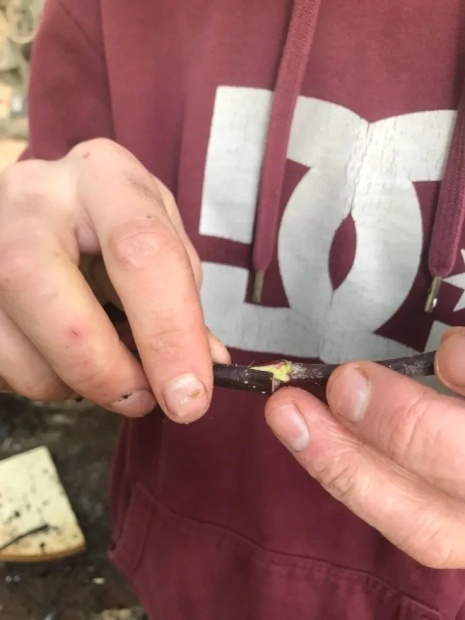 February 2026: For the second year in a row, this winter we are experimenting with grafting hardwood fruit trees. Grafting is an important technique for propagating specific apple varieties because the seeds from these fruits do not grow “true to type” - their offspring are always different than the parent tree. Grafting involves taking a small piece of branch—the "scion wood"—from a desired, high-quality apple tree, such as Spartan, Liberty or Granny Smith, and joining it onto a separate root system, or "rootstock." This process effectively clones the chosen variety.