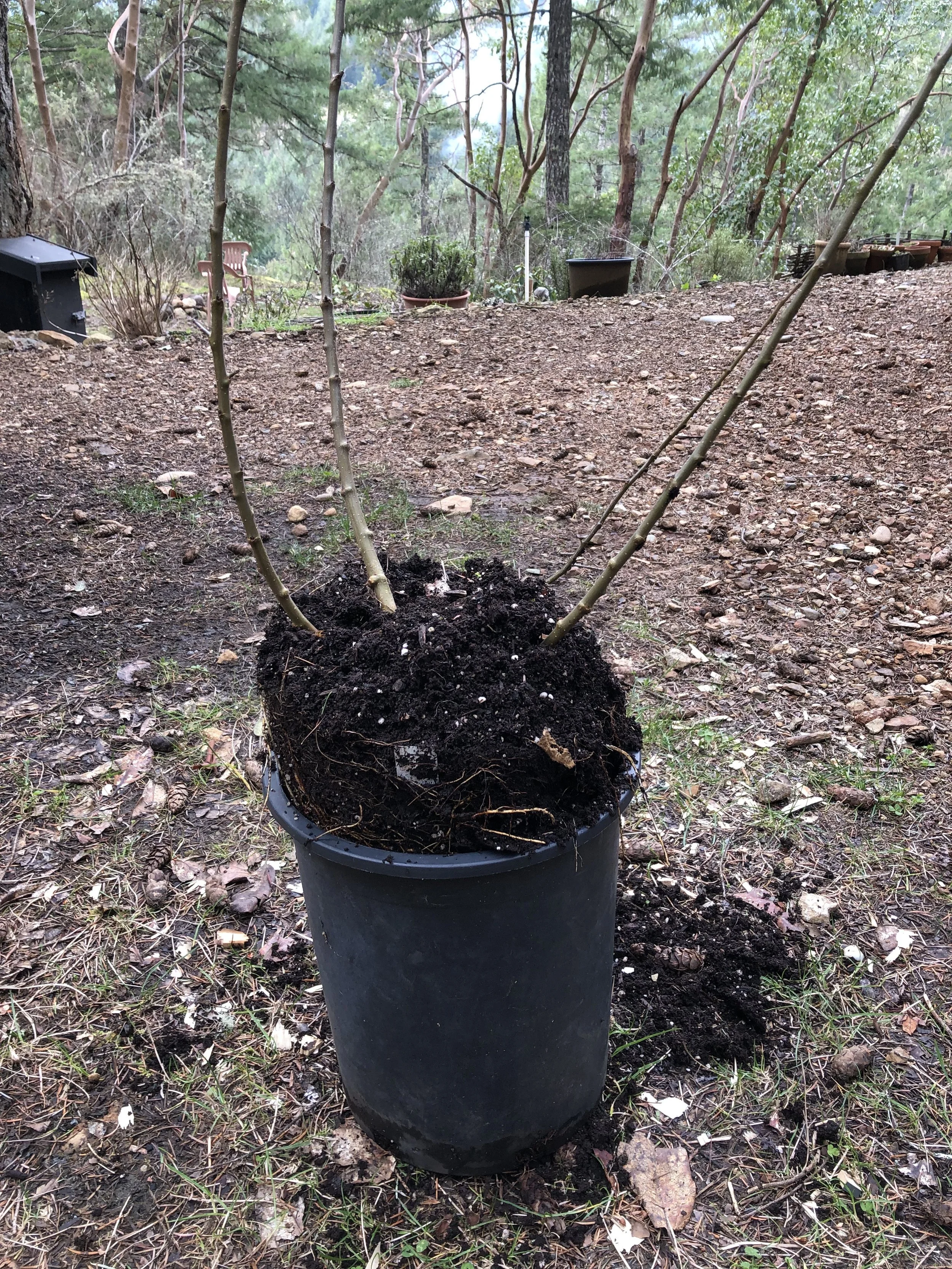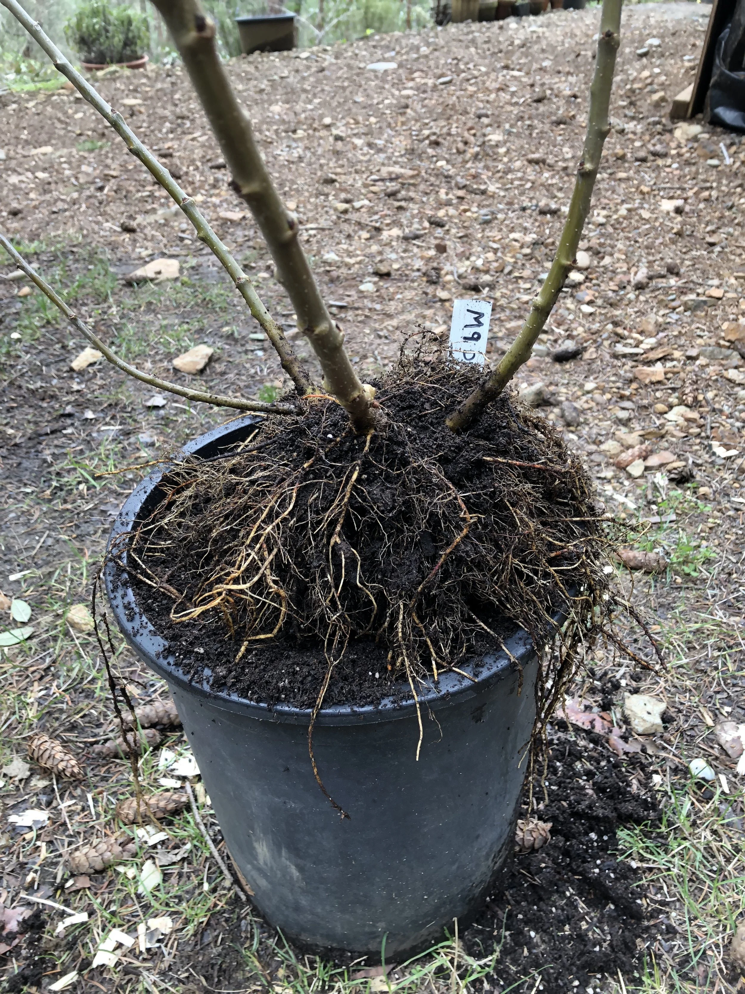 Grafted trees need to be planted in good potting soil, watered, and staked for support. We write the variety name on the stake using permanent marker.
