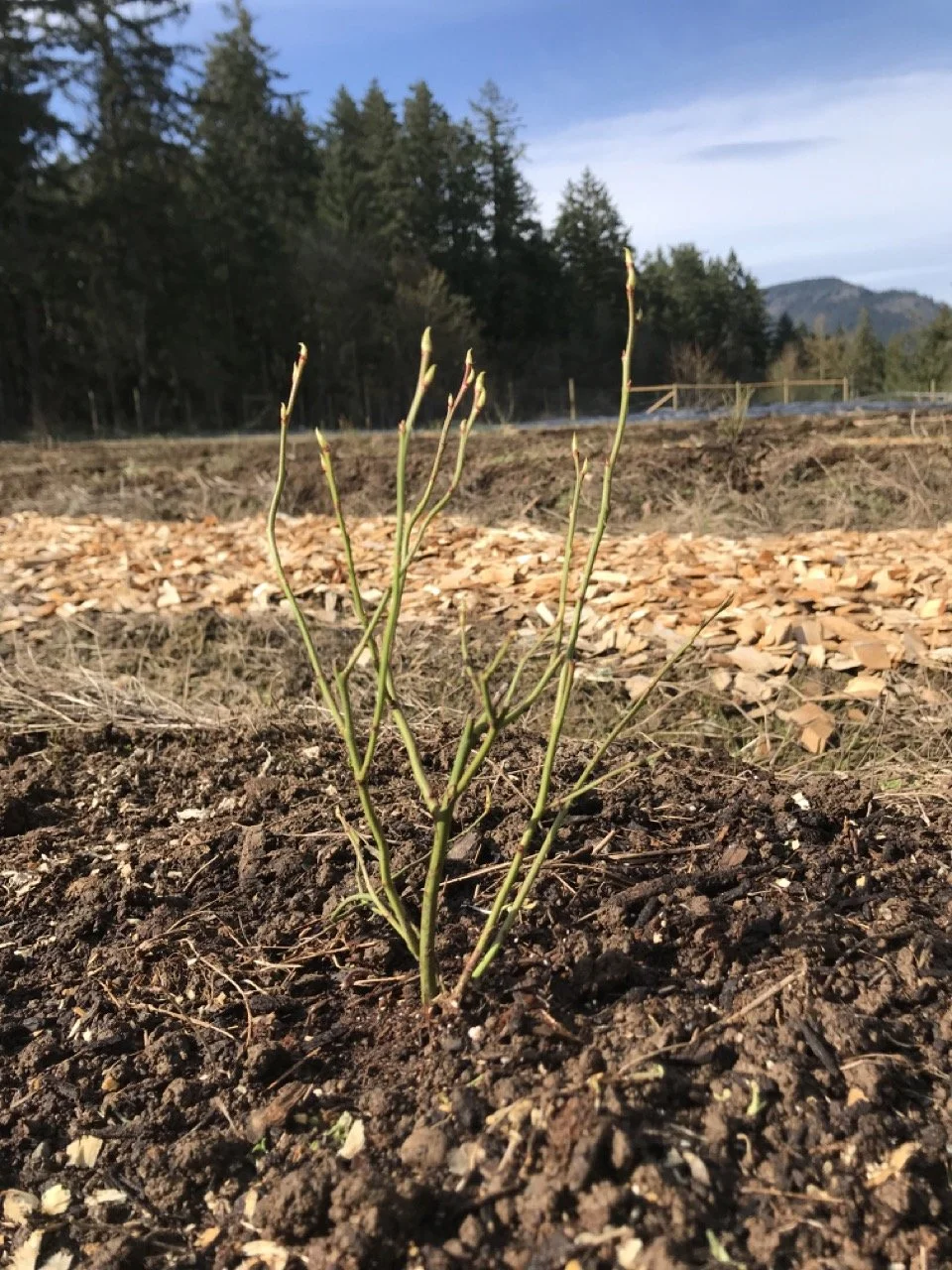 Every blueberry was planted with a scoop of compost, bone meal, and fertilizer. Notice the clover seedlings everywhere!
