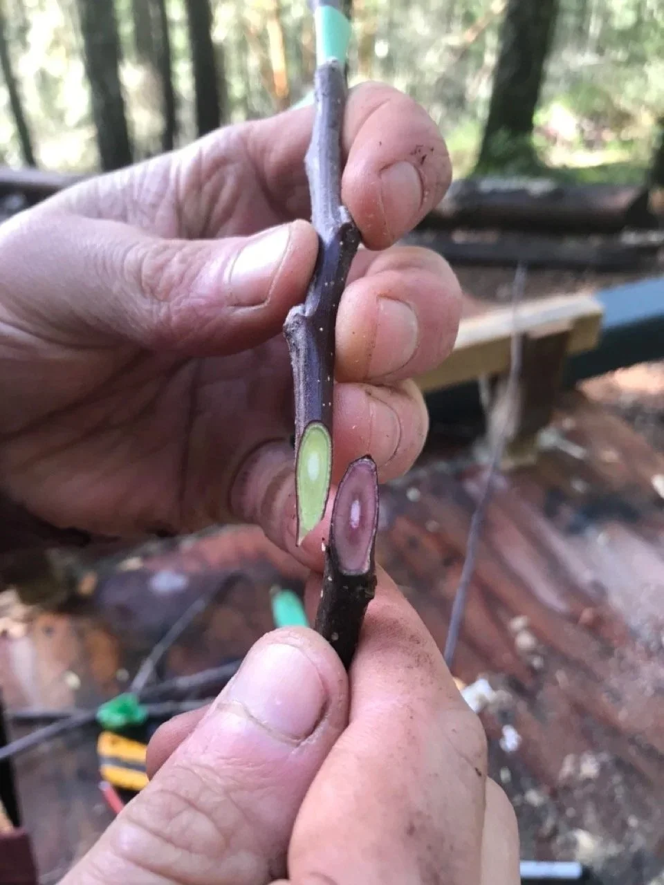 Scion wood (L) and Rootstock wood (R), initial cuts exposing the cambium layer.